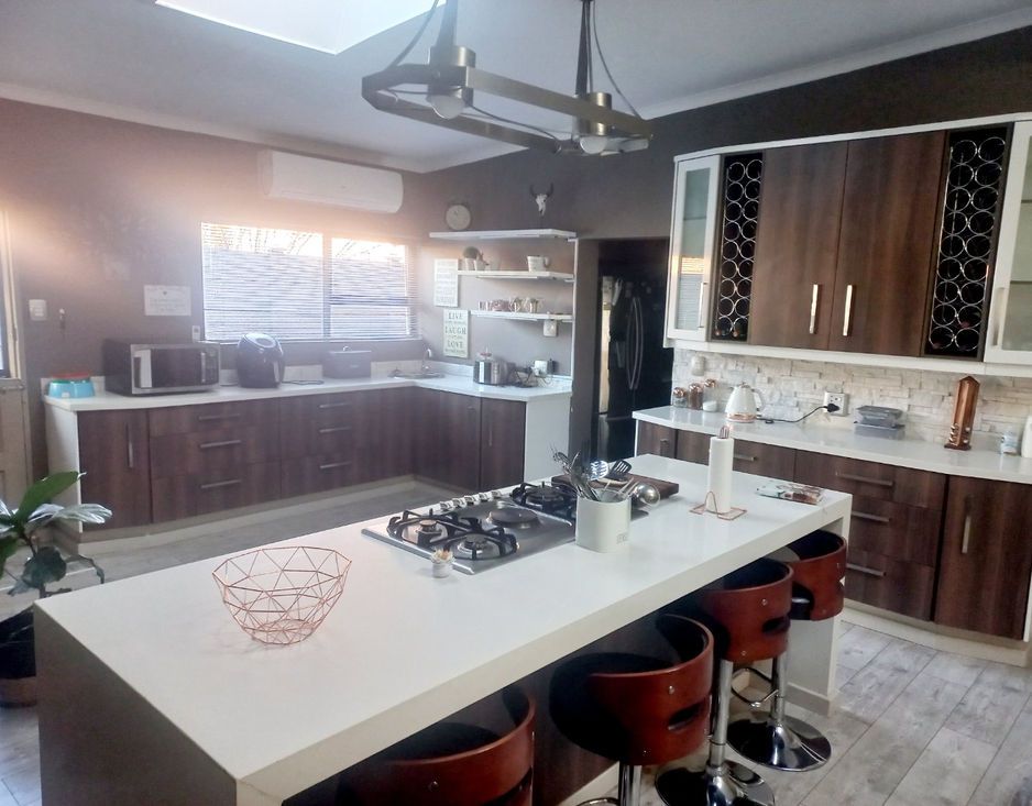 A spacious, modern kitchen that is open plan to the family room with fireplace. The kitchen offers a breakfast nook, beautiful granite counter tops, gas hob with electric stove, more than enough built in cupboards and a separate scullery with laundry facilities.